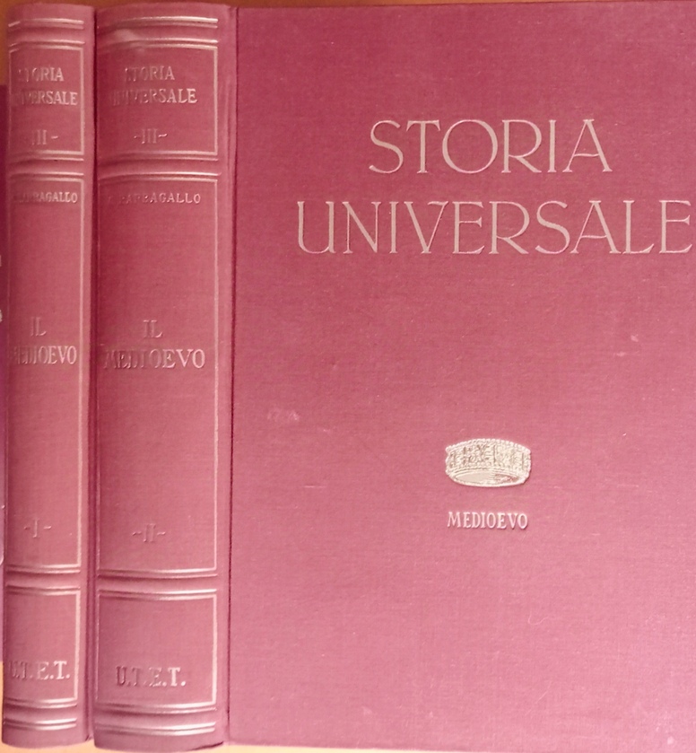 UTET 1952 Nuova edizione riveduta e ampliata Storia universale III, 2 volumi tutta tela rossa con titoli oro al dorso e al piatto; con 12 tavole, 40 cartine geografiche e 826 figure nel testo, pp. 1218 complessive Ottime condizioni generali, minimi segni alla telatura
