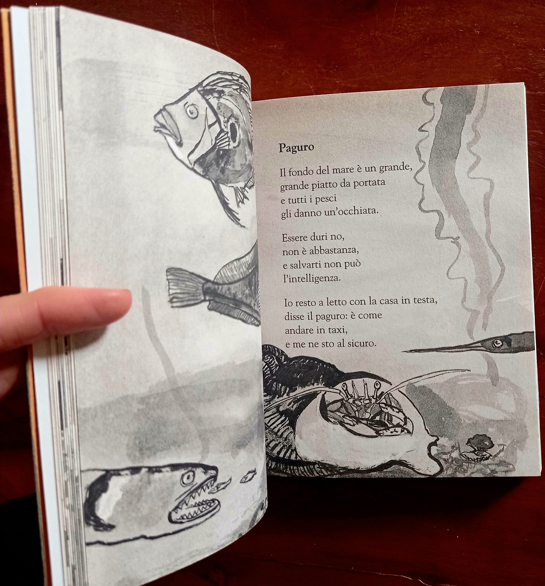 Pubblicata postuma dopo l’atteso Lettere di compleanno, l’ultima opera di Ted Hughes è dedicata ai bambini: ventotto brevi poesie sul mare e sulle creature che lo abitano: aragoste simili a cavalieri in armatura, petulanti pulci di mare e mostri favolosi, granchi simili a cassette degli attrezzi con le gambe, squali chirurghi, patelle innamorate della tempesta, naufraghi trasformati in cormorani, ciottoli che conservano la memoria di ere remore, balene canore che appaiono per un attimo all’orizzonte. Un mondo blu e verde, segreto e primigenio, raccontato attraverso immagini rapide e abbaglianti da un poeta-sirena capace di incantare i grandi e i piccoli con la sua voce. A partire dai 9 anni
