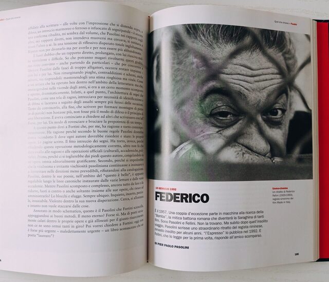 “Il libro che ora pubblica l’Espresso è il più completo e impressionante corpus di articoli, testimonianze, valutazioni critiche e polemiche di e su Pier Paolo Pasolini in occasione del quarantennale della sua tragica scomparsa. Dico questo in esordio, perché mi serve collocare meglio quello che dirò (sommariamente) più avanti nel merito. Pasolini, – e Moravia, Fortini, Roversi, Fachinelli, Arbasino, Eco, Siciliano, Sciascia.. e, sullo sfondo, come termine perpetuamente oppositivo/contrastivo, Italo Calvino… e giornalisti di gran classe come Valerio Riva, Andrea Barbato, Corrado Augias, Enzo Golino… L’orchestrazione, in vita e in morte, intorno al poeta-polemista ideologo, cineasta.. e politico, anche (senza ombra di dubbio) è di primissimo ordine, il clima e il sapore di un’intera opera riemergono senza forzature storico-letterarie e storico-ideologiche in maniera straordinaria (almeno per chi c’è stato).
